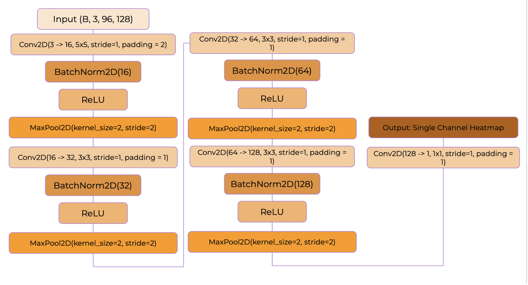 The planner for my model was iteratively built by training different architectures and seeing which achieved the lowest loss value on the training data. The best ConvNet architecture consisted of 4 convolutional blocks with 4, batch normalization layers, 4 MaxPooling layers, ReLU activation functions, and a final Convolutional layer which outputs a single channel heatmap [1]. Running a spatial argmax on said heatmap returns a tensor containing the soft-argmax in normalized coordinates: the aimpoint. The model was trained using the After 120 epochs of training, the loss plateaued. The lowest loss value achieved by the planner during training was 0.0560.