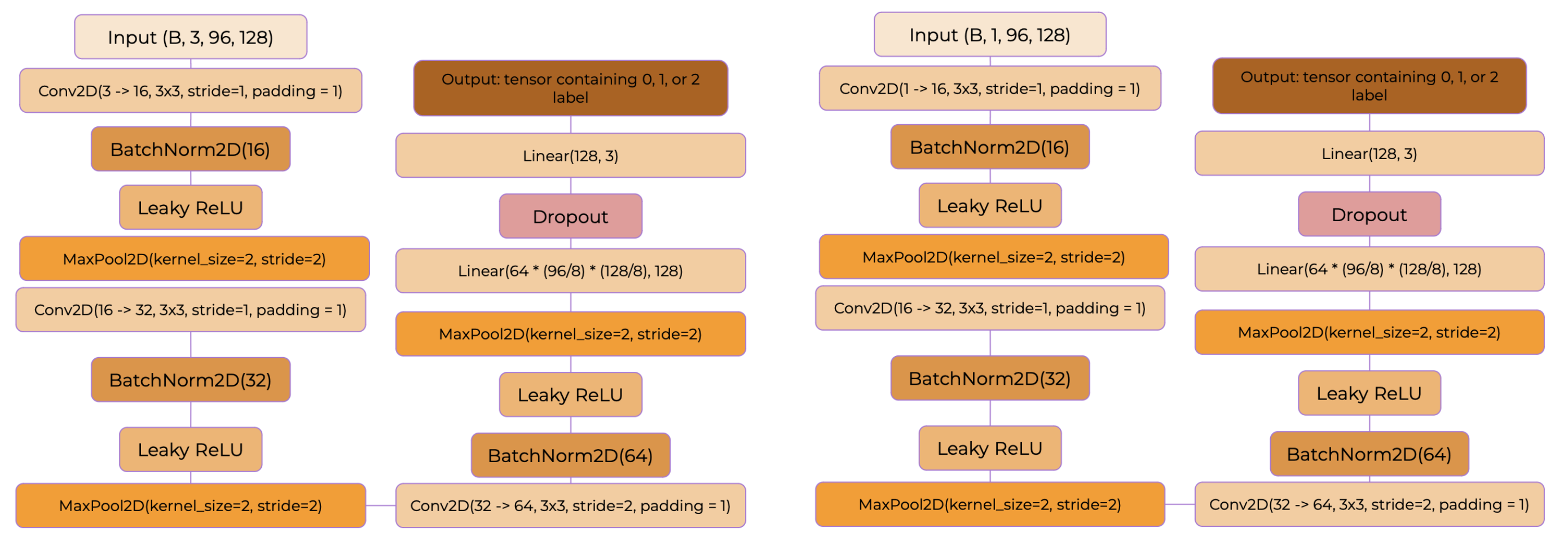 Figure 3. (left, Right) RoadClassiffier and GrayScaleRoadClassifier Neural Network Arhitectures