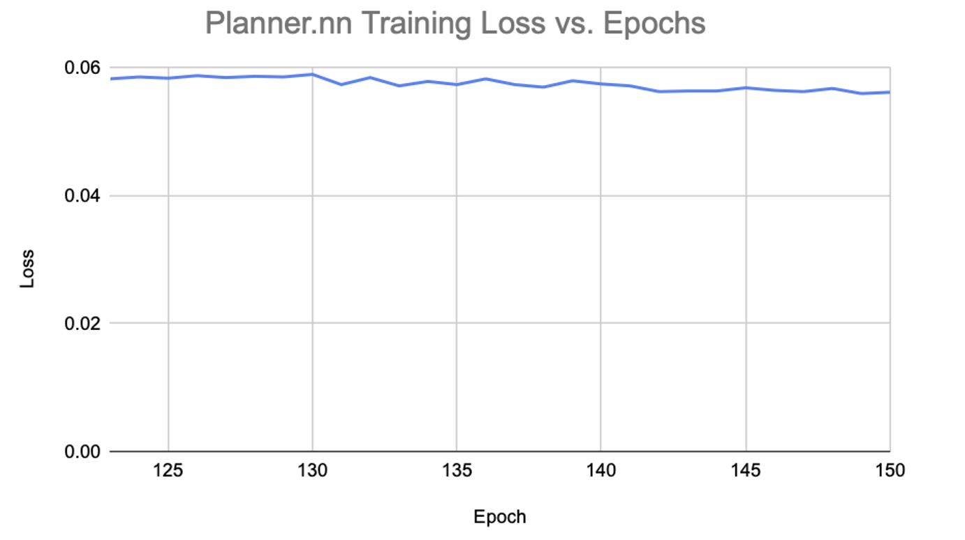 Figure 1. Planner Loss vs Epoch for epochs 123 through 150